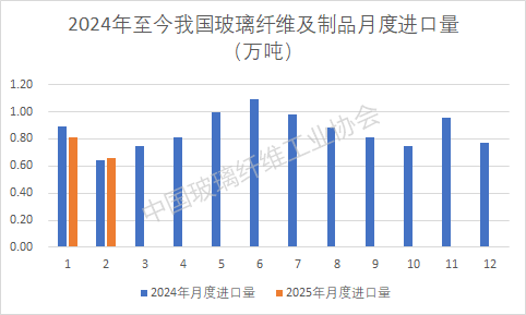 31项具体税目产品中:1-2月出口量位列前三位的依次是玻璃纤维无捻粗纱、长度不超过50毫米的玻璃纤维短切原丝、玻璃纤维制化学结合毡,三类产品出口量分别为11.40万吨、5.10万吨、2.71万吨。三项产品合计出口量为19.20万吨,占1-2月总出口量的63.49%。 2025年1-2月,我国玻璃纤维及制品累计进口量为1.48万吨,同比下降3.5%。1-2月进口金额累计1.74亿美元,比去年同期上升57.1%;前两个月进口均价11756.76美元/吨,与去年同期相比进口均价提升62.05%。 其中,1月单月玻璃纤维及制品进口量为0.81万吨,同比下降9.0%。2月单月玻璃纤维及制品进口量为0.66万吨,同比上升3.1%,环比下降18.5%。