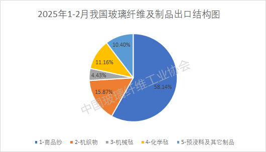 出口产品构成方面:商品纱、机织物、机械毡、化学毡、预浸料及其他制品五大类别产品,2025年度1-2月累计出口量分别为17.58万吨、4.80万吨、1.34万吨、3.37万吨、3.14万吨,占比分别达到58.14%、15.87%、4.43%、11.16%、10.40%。