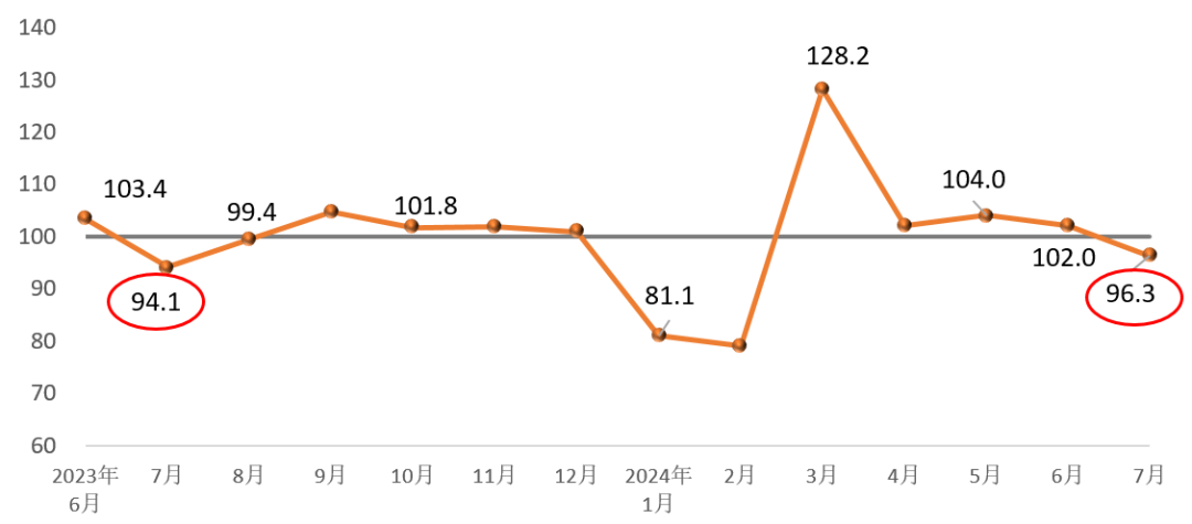 2024年7月份,建筑材料工业景气指数为96.3点,比6月份回落5.7点,比上年同月高2.2点,低于临界点,处于非景气区间,行业经济运行偏弱态势与季节性回调因素相叠加。