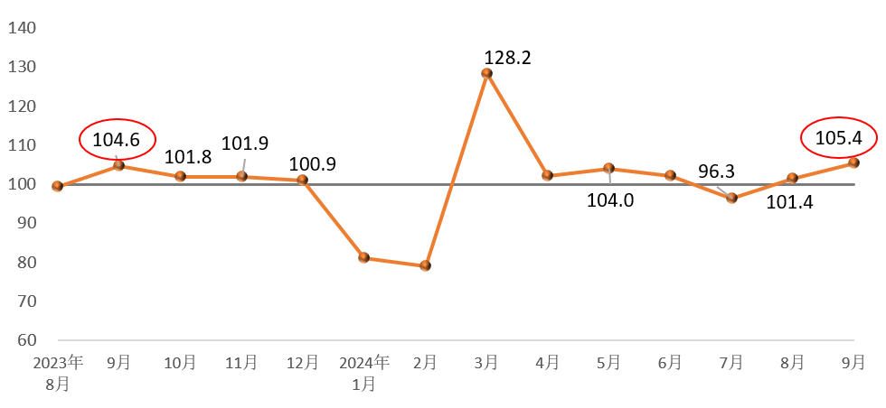 2024年9月份,建筑材料工业景气指数为105.4点,比8月份回升4.0点,比上年同月高0.8点,高于临界点,处于景气区间,行业经济运行保持低位回复态势。