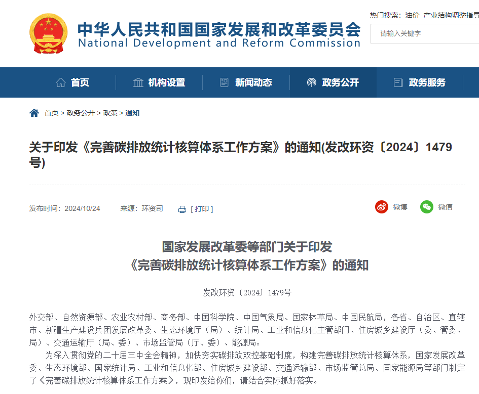 国家发展改革委等部门印发《完善碳排放统计核算体系工作方案》